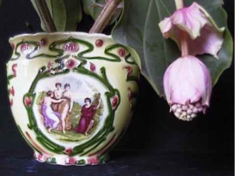 Blumenübertopf Gelb mit grünem Jugendstilmuster und buntem Medaillon mit Frauenmotiv. Um 1900. Keramik Höhe : 19 cm Breite : 23 cm Krackelierungen