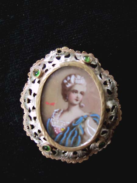 Brosche Metallmontierung mit grünen Steinen besetzt Portrait signiert Höhe : 5 cm Breite : 4 cm