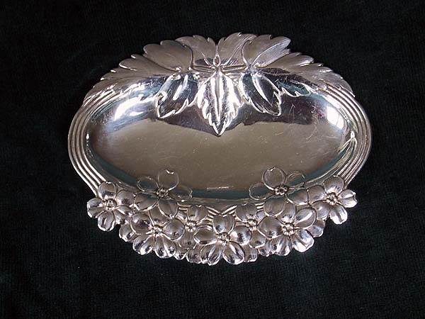 Ovaler Jugendstilteller mit Blumen und Blattornamenten versilbert aus Schweden Länge : 12,5 cm Breite : 10 cm