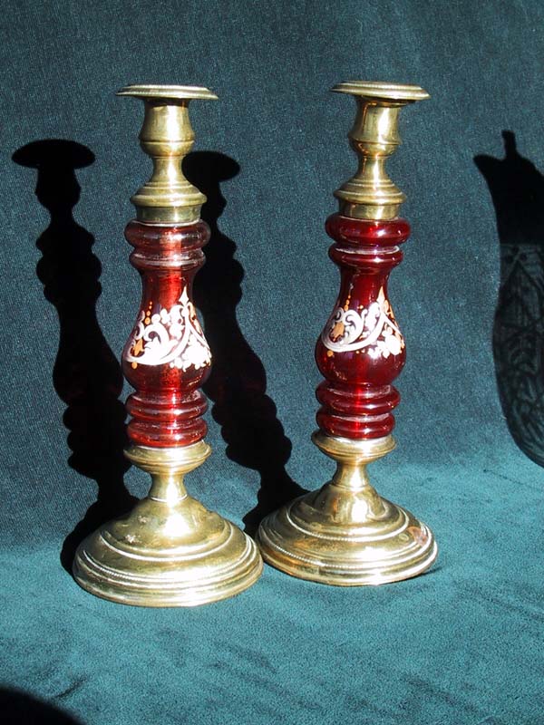 Paar Biedermeierleuchter Mässing mit rotem Glas bemalt Höhe : 24 cm Durchmesser : 9,5 cm Die Leuchter haben einige Beulen und Knicke