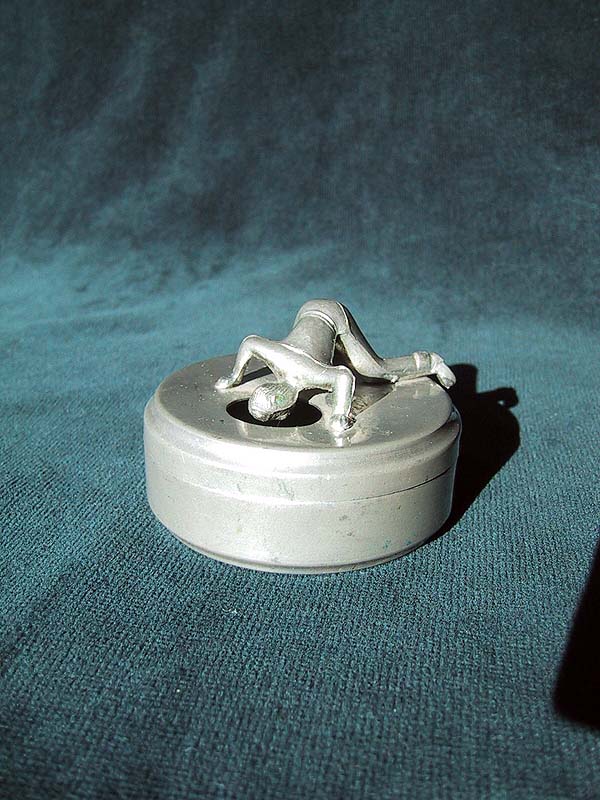 Dose aus Zinn für Manschettenknöpfe Aus Schweden Sign. Durchmesser : 6,5 cm Höhe : 4,5 cm mit Figur